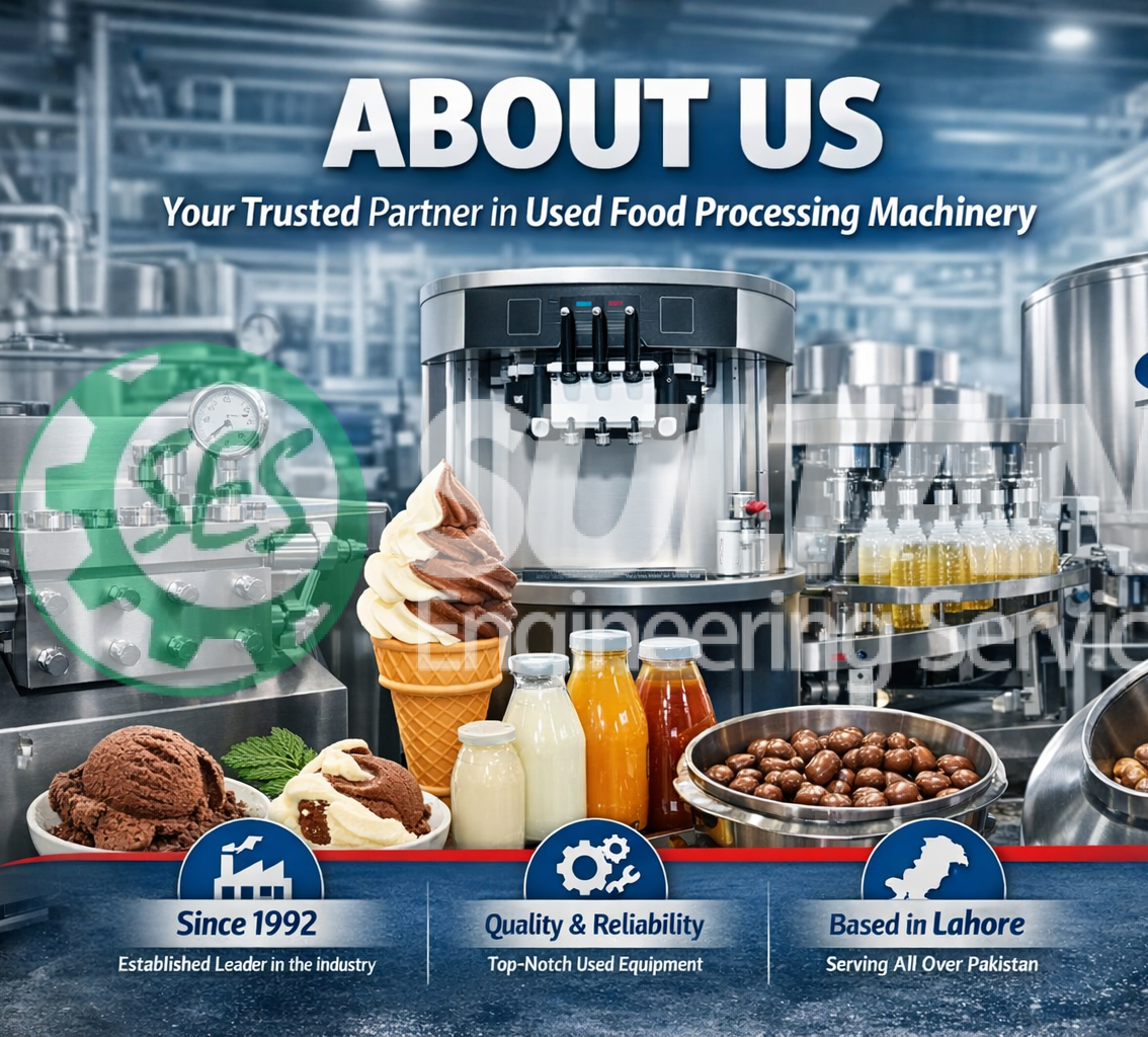 Over the years, Sultani Engineering Services has built a strong reputation for supplying high-quality used food processing machinery, dairy equipment, and ice cream production machines across Pakistan. We carefully inspect, test, and refurbish every machine to ensure reliable performance and long service life. Our mission is to provide cost-effective industrial solutions to factories, dairy plants, bakeries, and food manufacturers while maintaining the highest standards of quality, honesty, and after-sales support. With a dedicated technical team and a commitment to customer satisfaction, we continue to serve businesses nationwide from our base in Lahore.